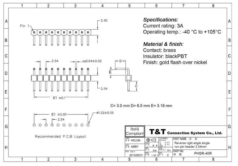 TÜSKESOR 40 P 90° PHSR-40R (T-T) 2.54mm PIN 0.64x0.64 AU.TÖRD.