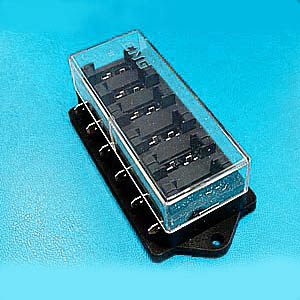 Oldal kivezetéses biztosíték tartó ház 6db normál késes biztosítékhoz, felsaruzva, kupakkal. Mérete: 117x38x42mm.