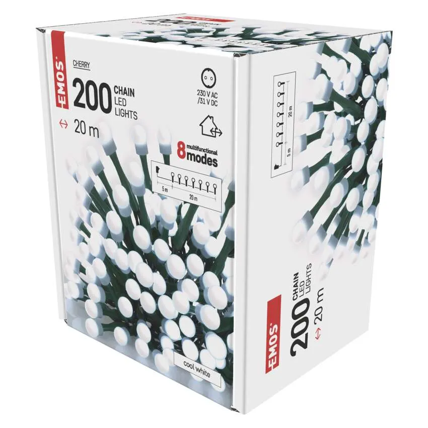 A multifunkcionális CHERRY fényláncok - tökéletes dekorációk a karácsonyi hangulat megteremtéséhez. Belső és a külső terekben egyaránt felhasználhatók. 8 előre beállított fénymóddal rendelkezik. LED fényük apró fehér gömbökben van elhelyezve, amelyek már akkor is vonzóak, ha a lánc nem világít. A különböző hosszúságú és fény színű láncok tökéletesek dekoráláshoz, valamint karácsonyfák megvilágításához. A CHERRY láncok kikapcsolt állapotban is bájos fehér gömbökként szolgálnak, és sötétedés után varázslatos fényekkel teremtik meg a megfelelő atmoszférát.