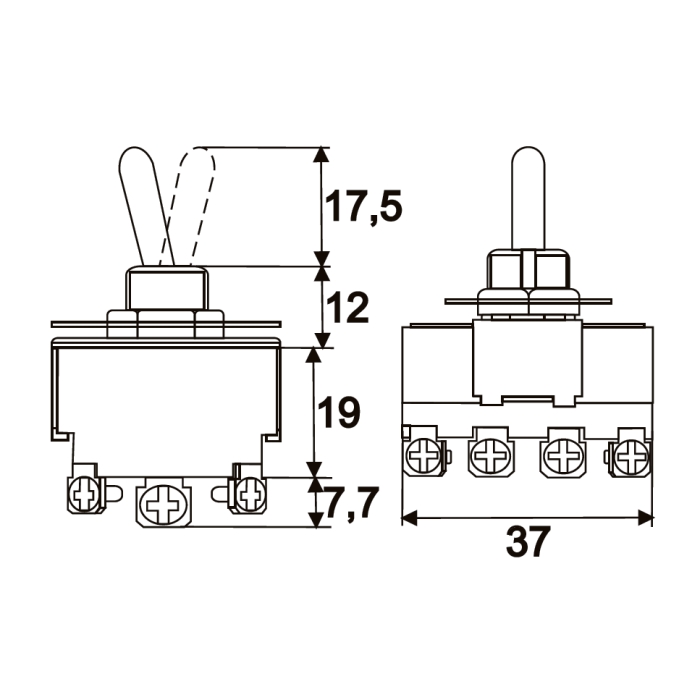 Karos kapcsoló, fém kivitel, kiválóan alkalmas műszaki gépek, berendezésekbe történő beépítésre. Maximum 10 A-ig terhelhető, fém előlappal rendelkezik.