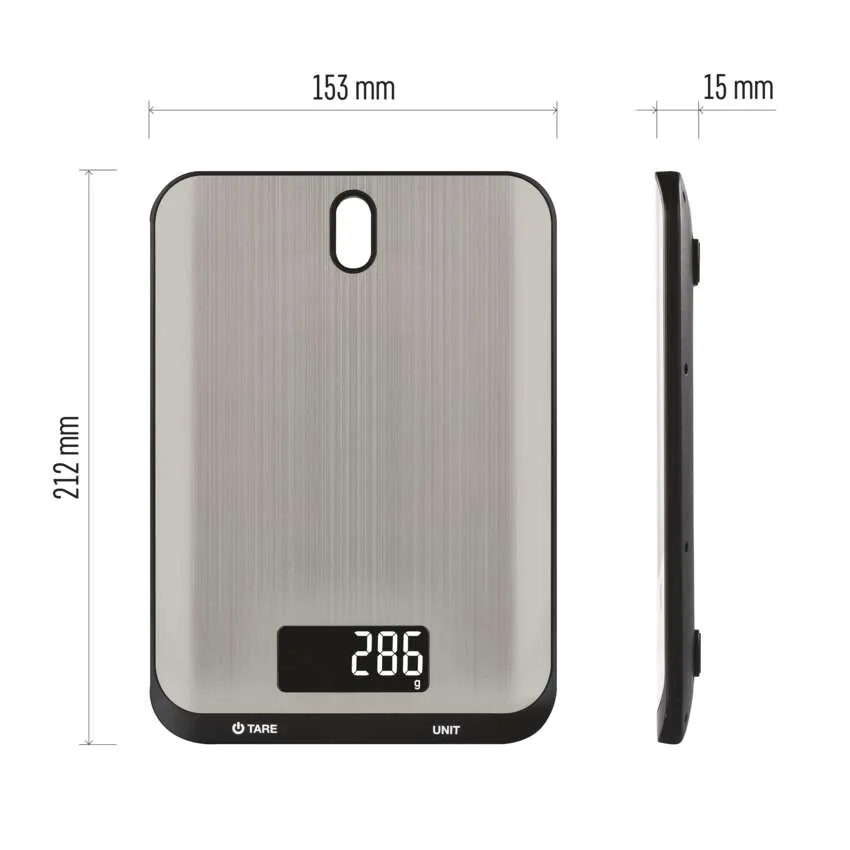 A tartós rozsdamentes acél kombinációja a modern kijelzővel és a karcsú megjelenéssel teszi ezt a mérleget stílusos darabbá, amely bármely konyhapulton jól mutat. A mérleg testén lévő praktikus lyuk lehetővé teszi, hogy kényelmesen fel lehessen akasztani. Mindig kéznél lesz, amikor szüksége van rá. A felakasztási mechanizmusnak köszönhetően nem áll fenn a sérülés veszélye, ha más nehéz konyhai eszközökkel együtt tárolja. Egy másik vitathatatlan előnye a megvilágított kijelző, amely segítségével könnyen láthatóvá válik a mérendő összetevők pontos súlya.