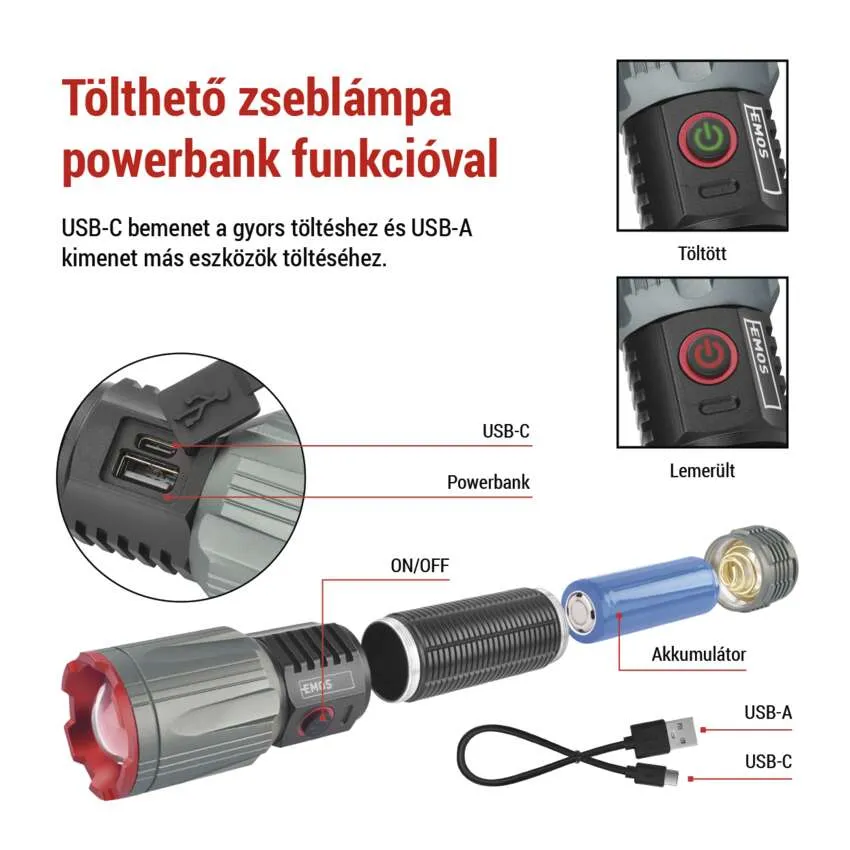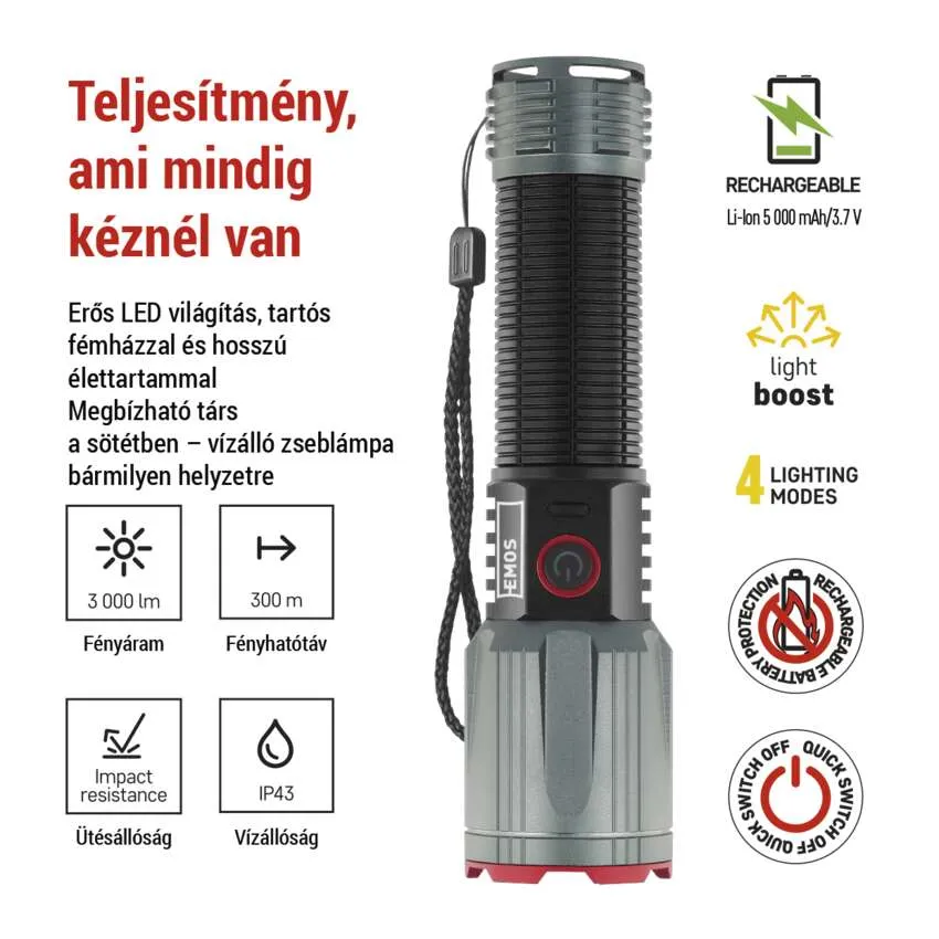 P3122 EMOS LED TÖLTHETŐ FÉM ZSEBLÁMPA 3000lm