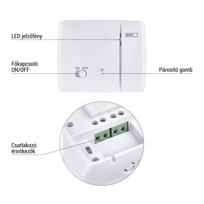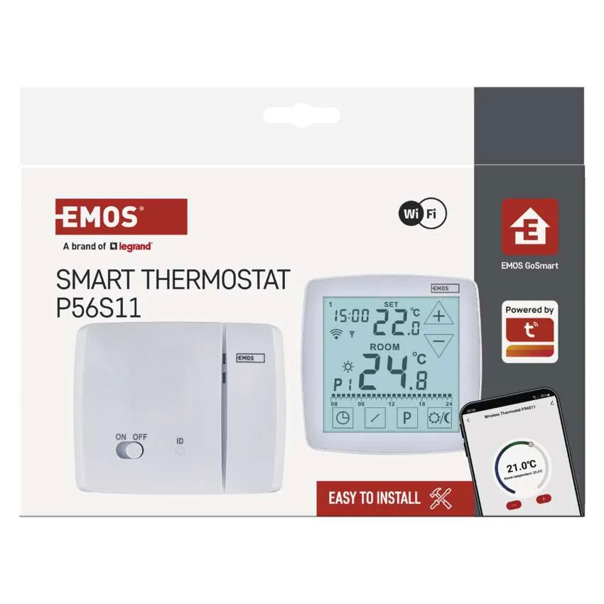 A P56S11 okos termosztát egy kapcsolóegységből (vevő) és egy adóból (termosztát) áll, melyek a mellékelt útmutató szerint könnyen párosíthatók egymással. Válasszon megfelelő helyet a termosztátnak - ideális esetben ott, ahol a háztartás tagjai leggyakrabban tartózkodnak. Egyszerűen helyezze a kapcsolóegységet a falra a hőforrás mellé, és csatlakoztassa a vezetékeket az egyértelmű ábrának megfelelően.